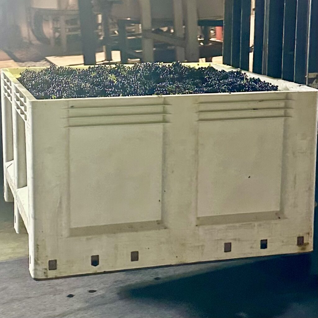We pick the grapes into half ton bins; this is approximately 1,000 pounds of Pinot Noir!