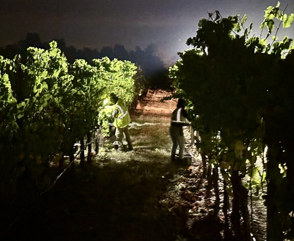 We pic our Estate Pinot Noir at night when the temperature is cool, it’s good for the workers and good for the grapes!